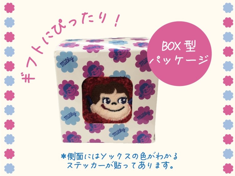 ペコちゃんの刺しゅうが入ったルームソックス。滑り止め付きなので安心です。