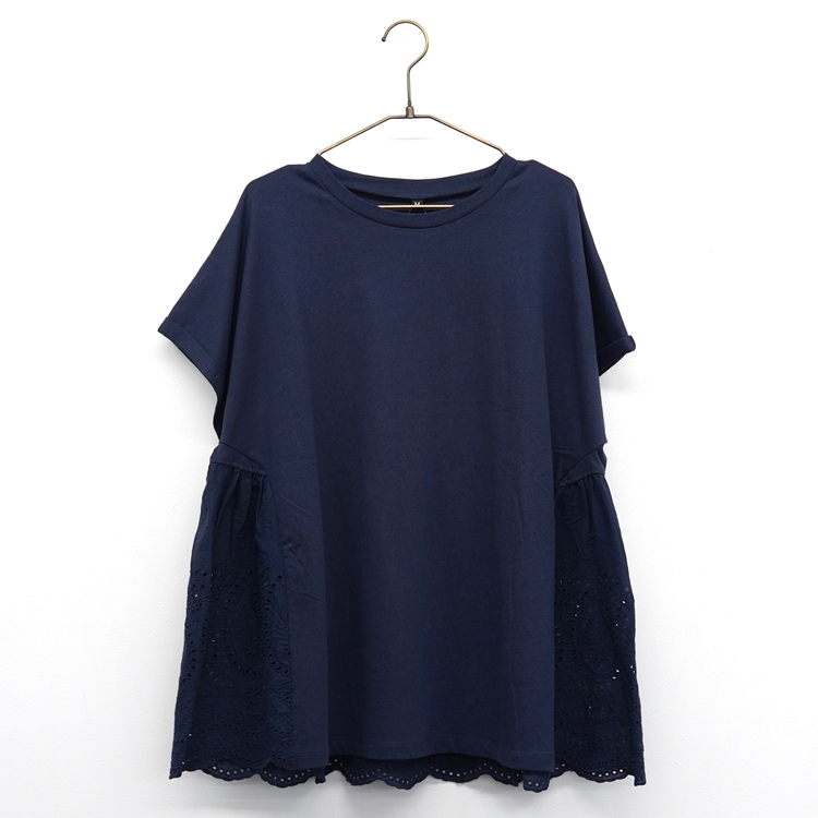 接触冷感機能付き綿素材のカットソーなめらかな肌触りでやさしい着心地です。背面に刺繍のスカラップ生地切り替えの入ったチュニックです。袖の折り返しがさりげないこなれポイント!