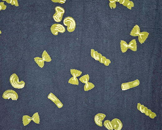 心ときめく食べ物柄。みんな大好き!パスタのプリントです。小さめモチーフで、ユニークで可憐なデザインです。