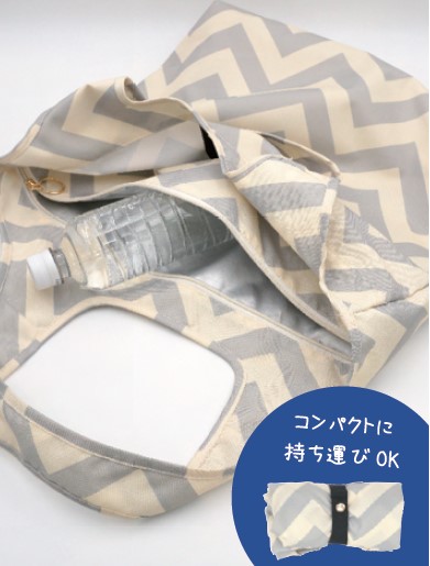 保冷と常温の食品が分けられる便利なエコバッグです。ゴムテープ付きで、コンパクトにまとめられます。