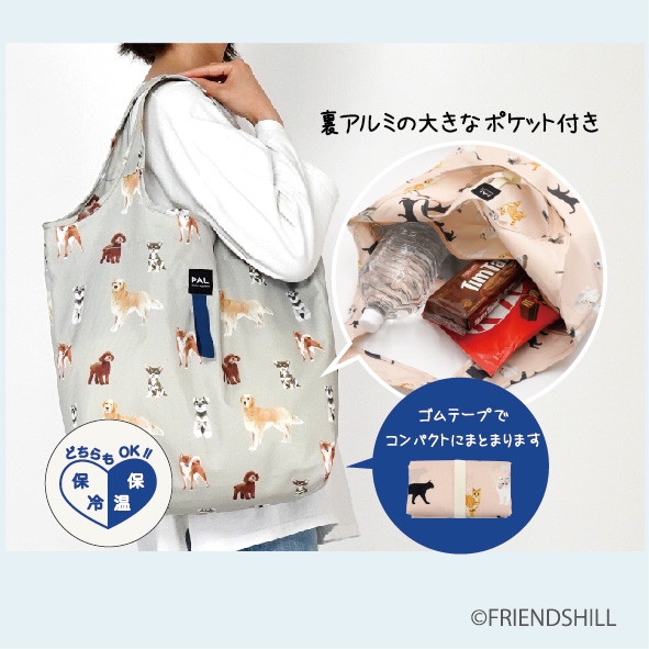 保冷と常温の食品が分けられる便利なエコバッグです。ゴムテープ付きで、コンパクトにまとめられます。