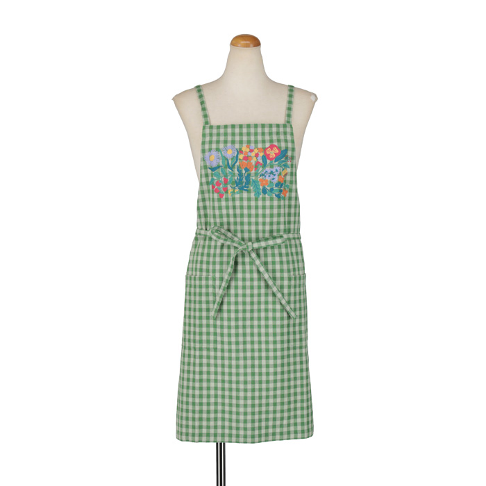 ギンガム生地にレトロ可愛い花柄プリントをあしらった、やさしい雰囲気のショートエプロンです。