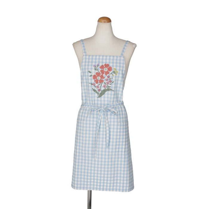 ギンガム生地に可憐な花柄を組み合わせた、どこか懐かしさのあるショートエプロンです。