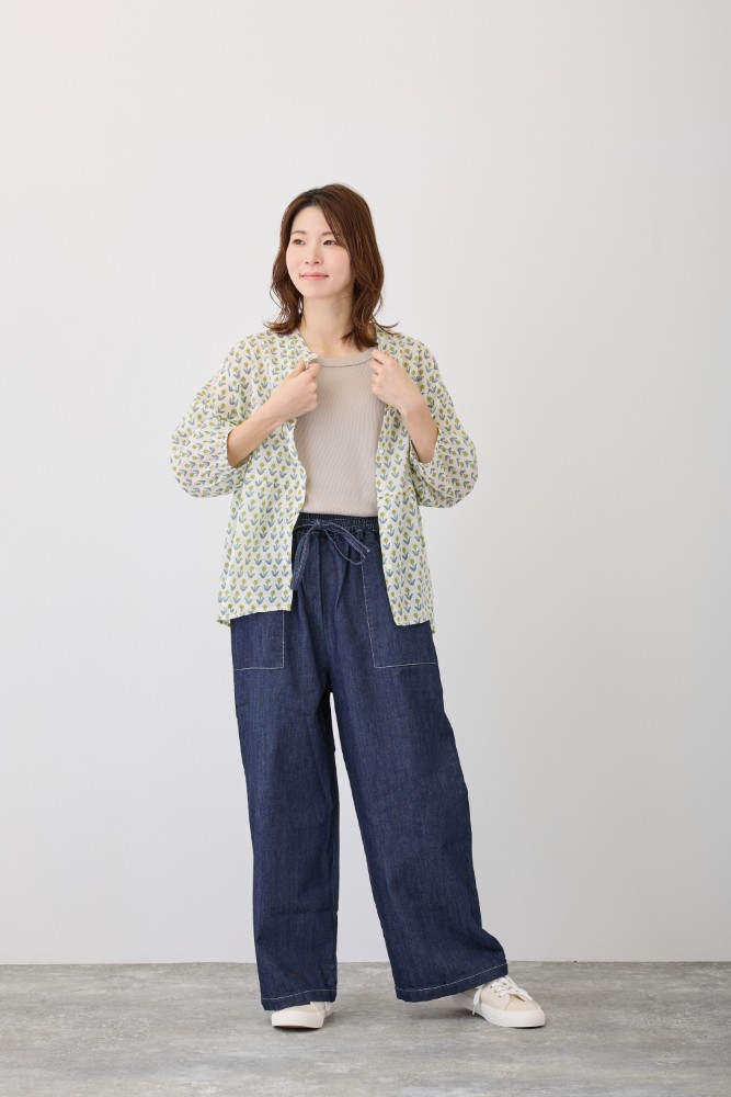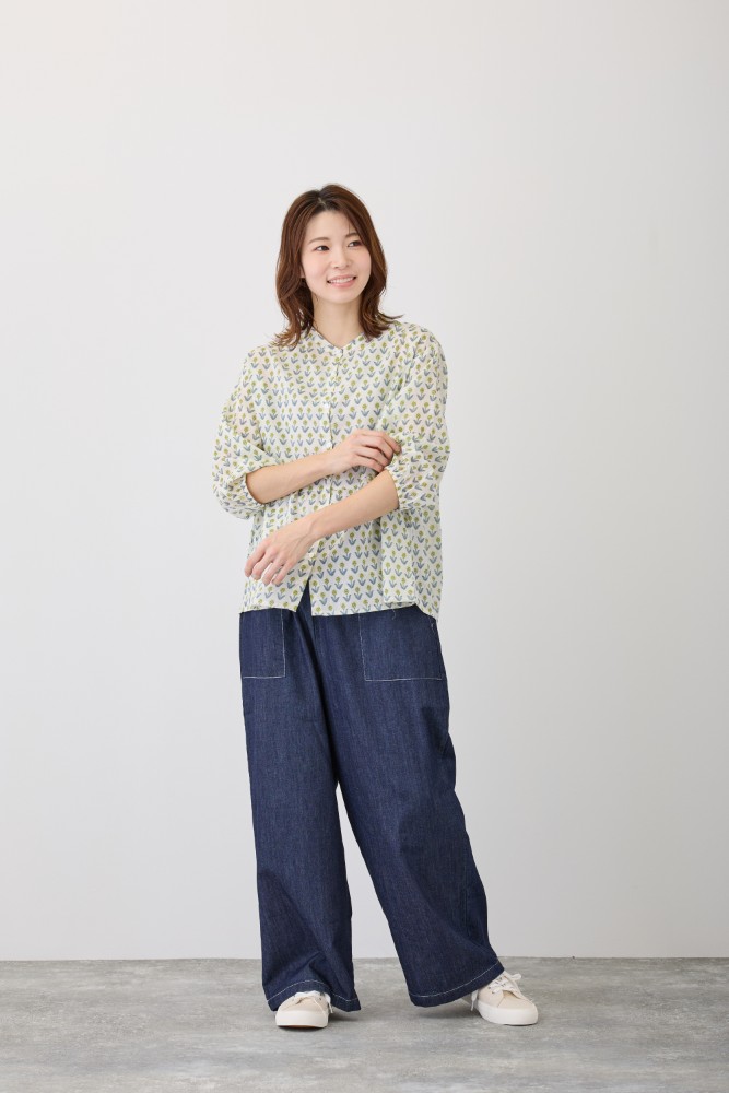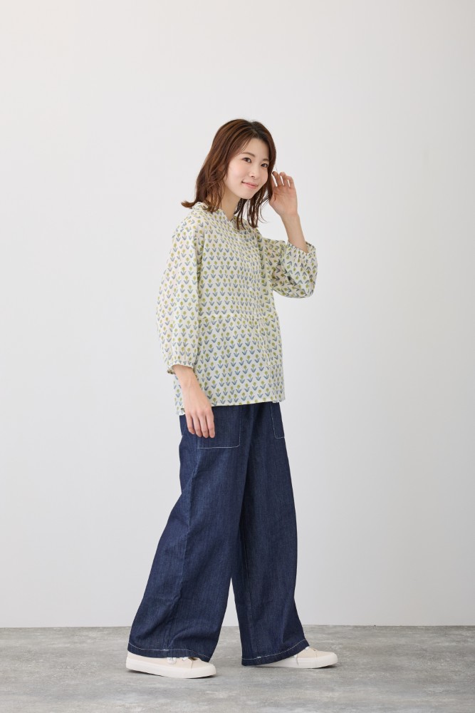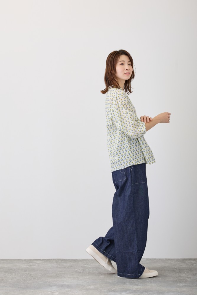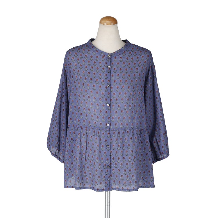 S4707プリヤファーム前開きプルオーバー手書きの小さな花をぎゅっと並べた、ちょっぴりレトロ感ある花柄。花のポイントカラーが、キュートな印象に。袖口がゴムになった、前開きタイプのプルオーバーです。切り替えギャザーが可愛らしい印象&体型カバーに。