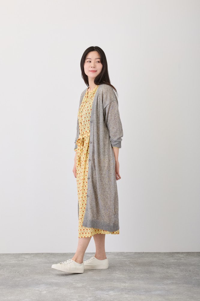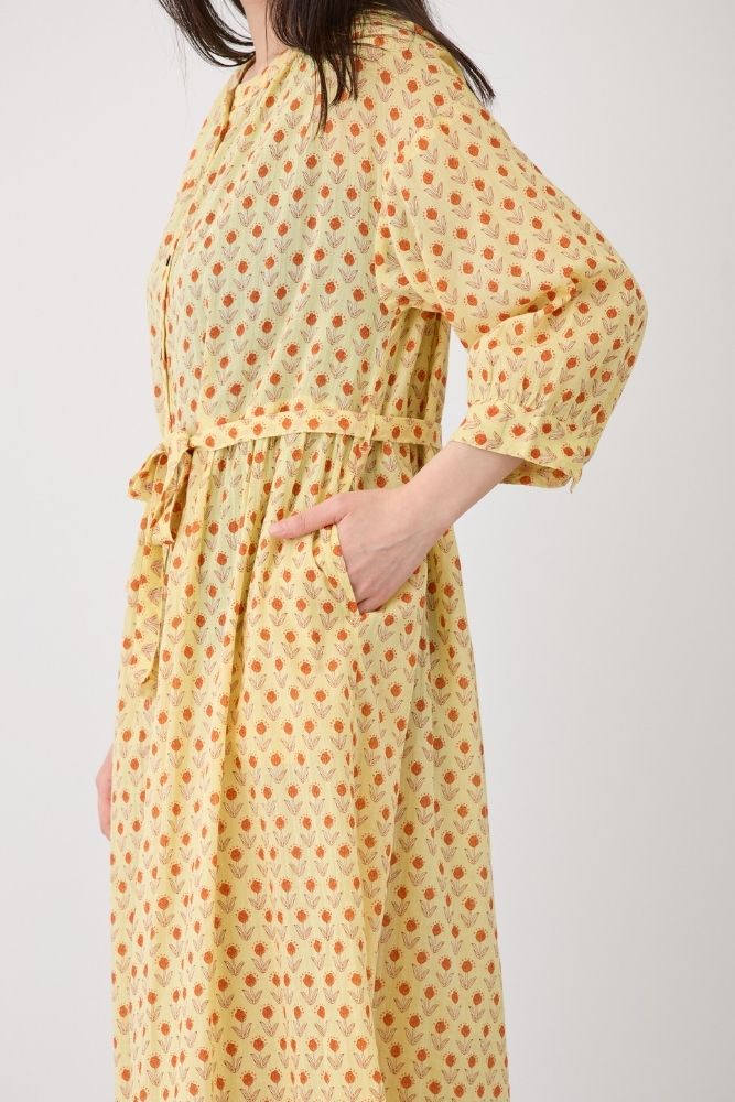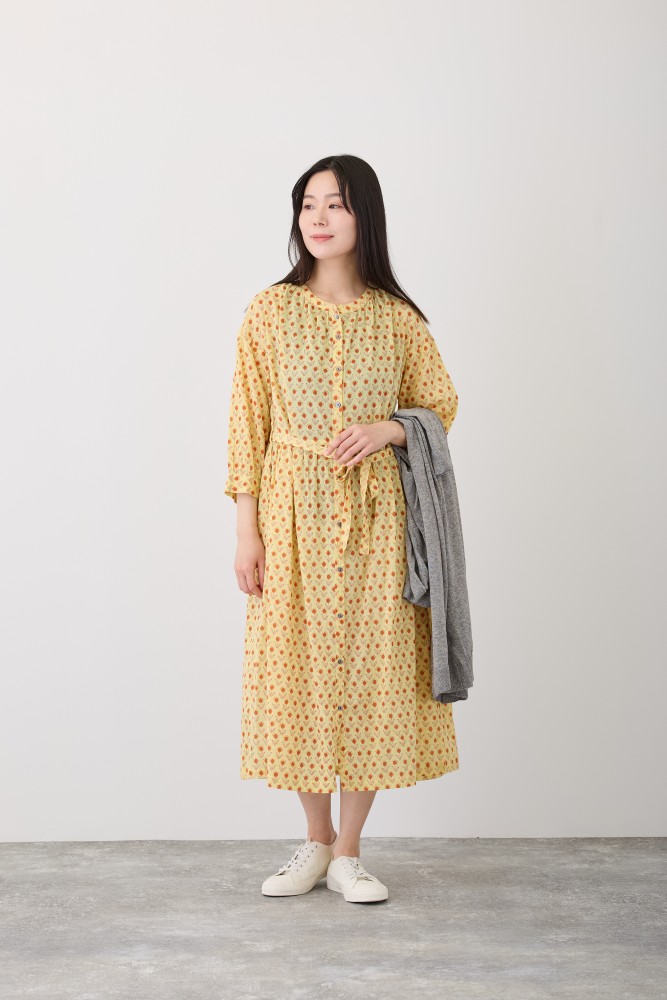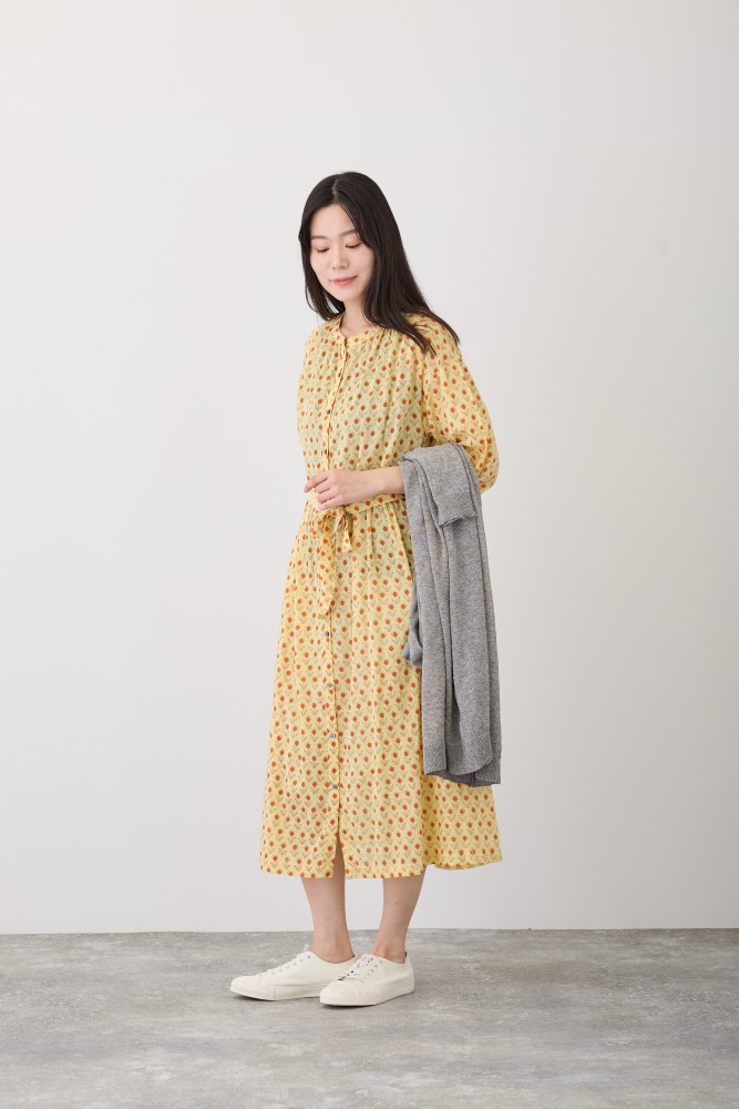 S4707プリヤファーム前開きワンピース手書きの小さな花をぎゅっと並べた、ちょっぴりレトロ感ある花柄。花のポイントカラーが、キュートな印象に。前開きのワンピースは、ボタンを外して羽織としても使える、お役立ちアイテム。