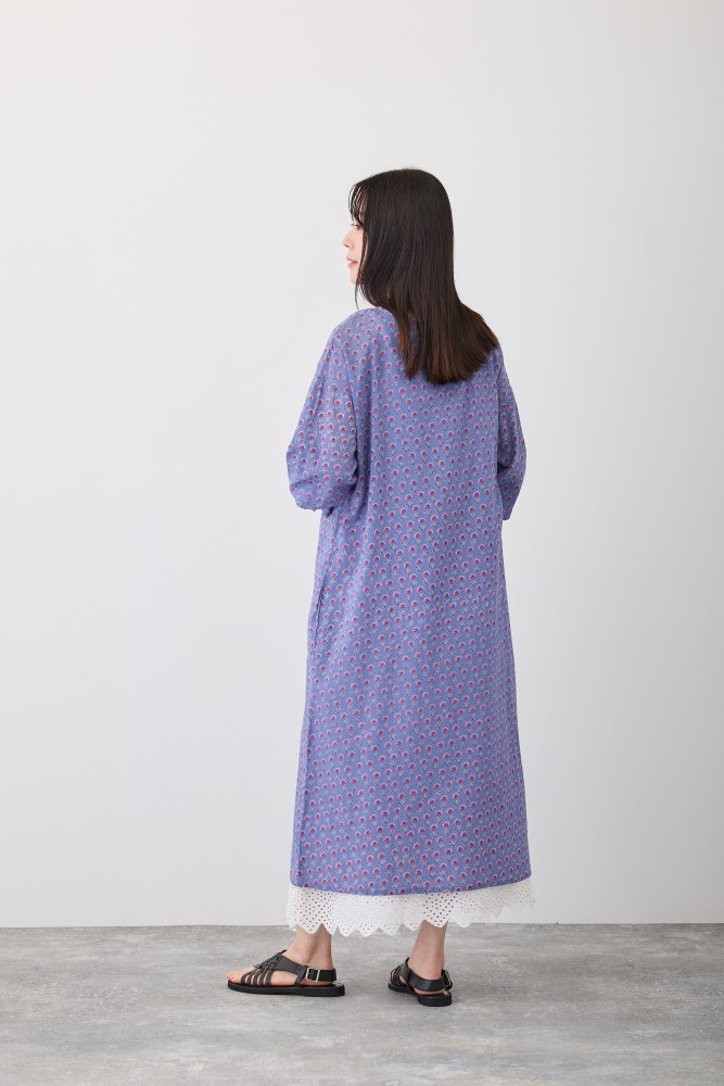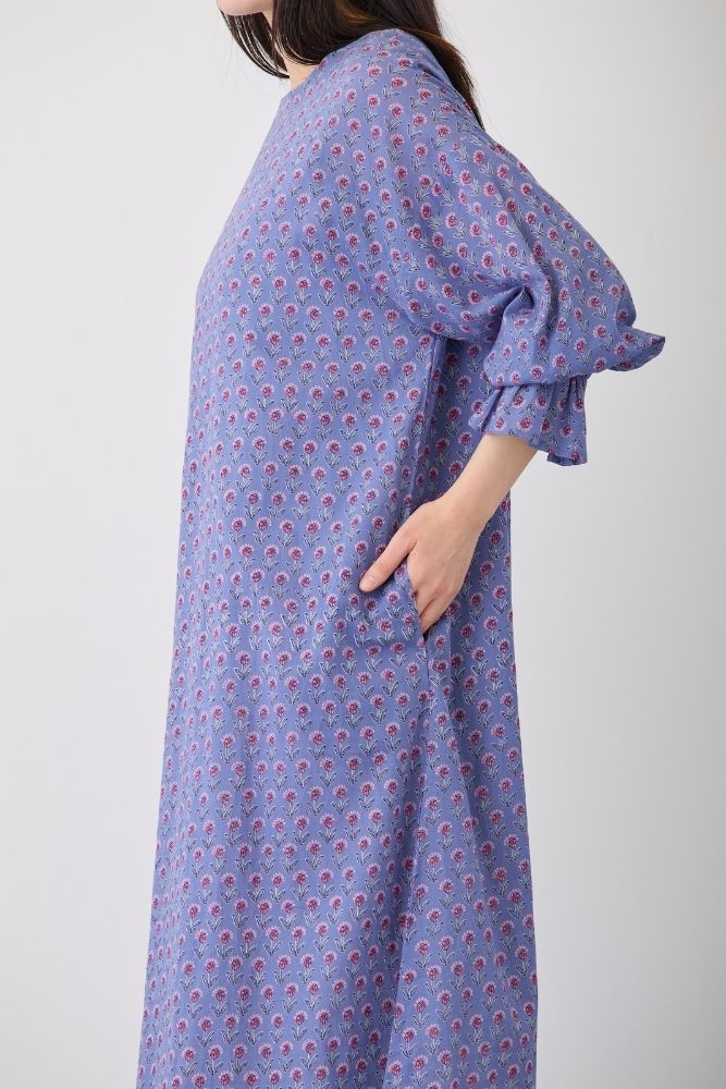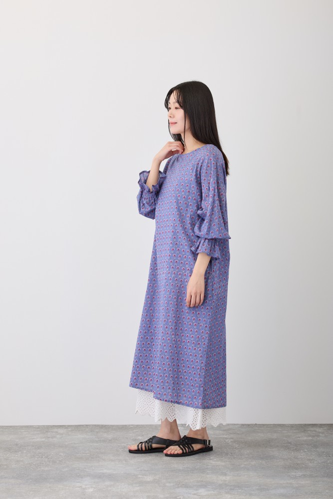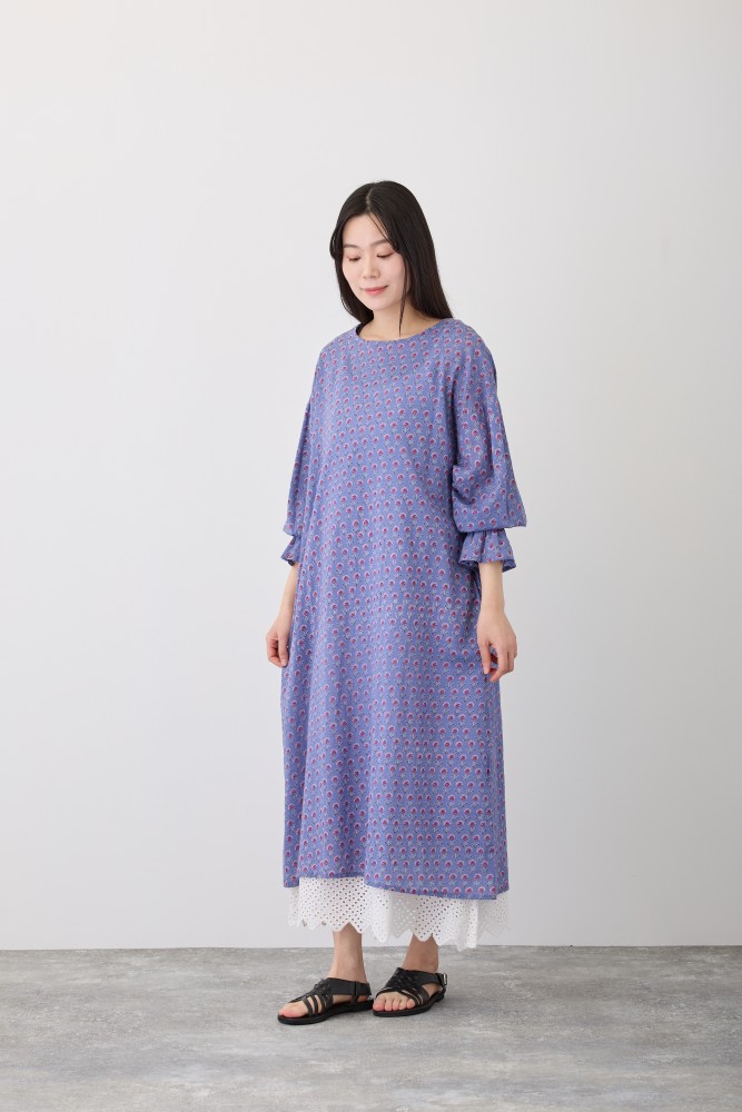 S4707プリヤファームフリルスリーブワンピース手書きの小さな花をぎゅっと並べた、ちょっぴりレトロ感ある花柄。花のポイントカラーが、キュートな印象に。トレンドのフリルを袖元にあしらったワンピース。袖はゴムなので、簡単に袖丈を変えられ、長いシーズン着ていただけます。