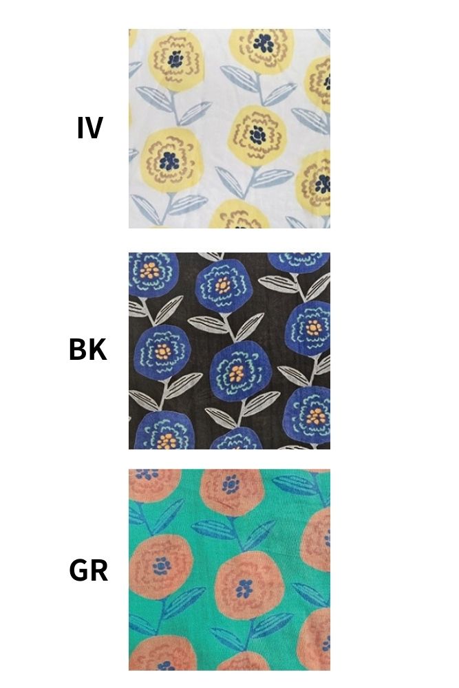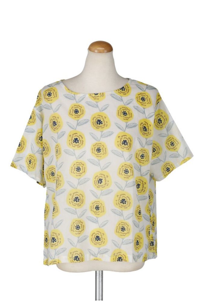 S4708サークルフラワープルオーバー大きな水玉が並んだように見える大花です。北欧テキスタイルふうの、元気をもらえる柄です。ほどよいゆとりのワイドシルエットで、シンプルな着こなしにぴったり。ボトムを選ばない丈感も絶妙です。