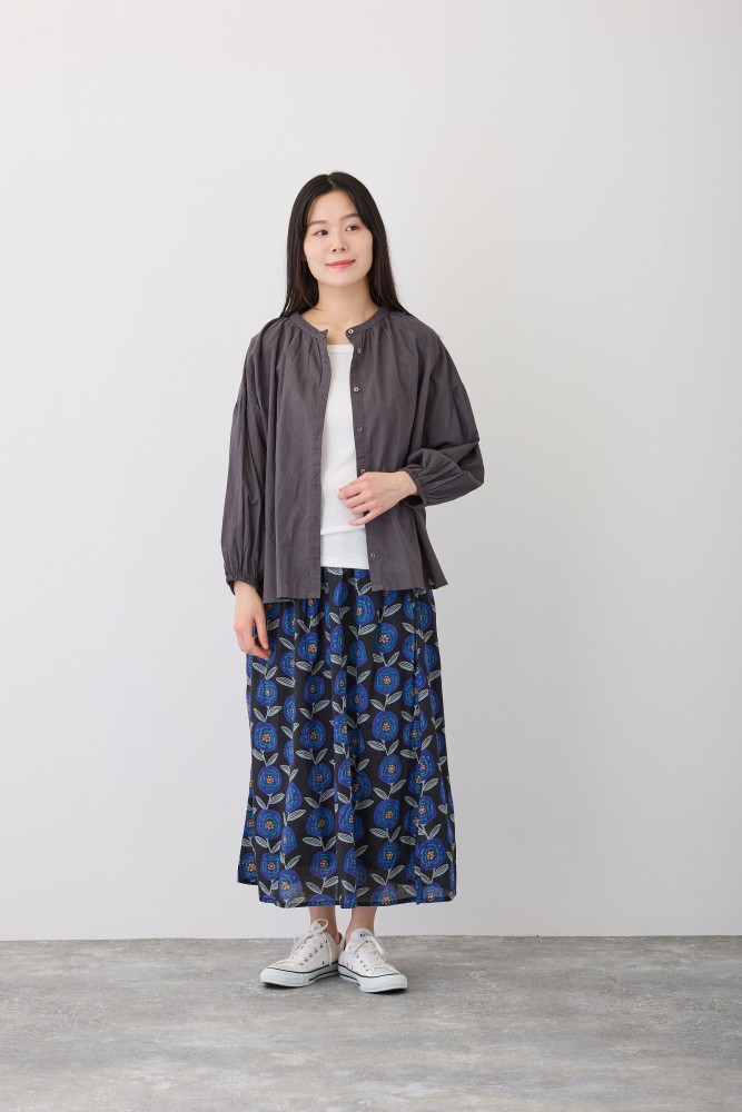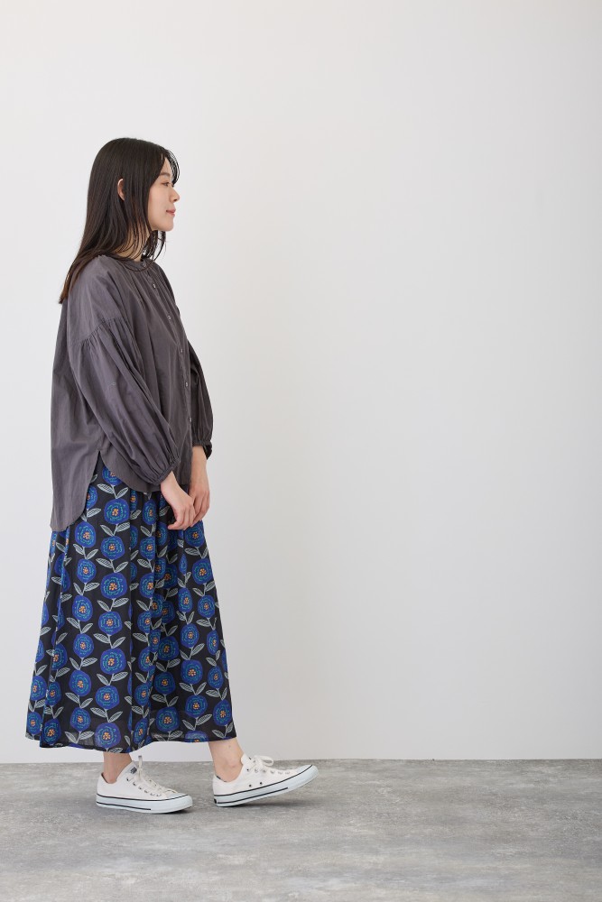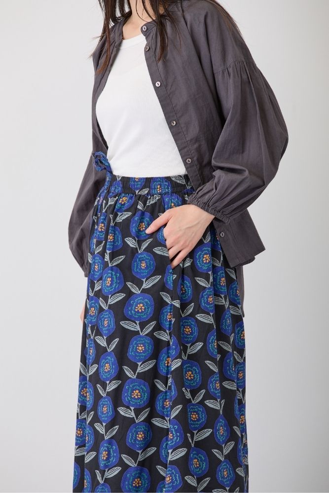 S4708サークルフラワースカート大きな水玉が並んだように見える大花です。北欧テキスタイルふうの、元気をもらえる柄です。T シャツなど、シンプルなトップスに合わせて、コーデが完成。ウエストゴム仕様で、内側紐で調整可能。ポケット付き。