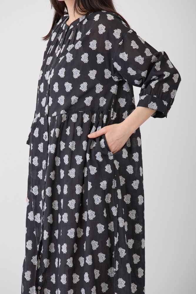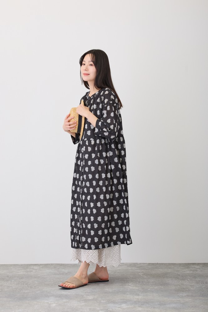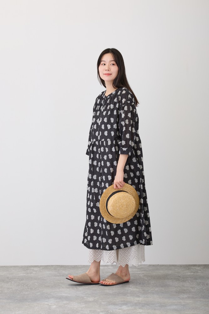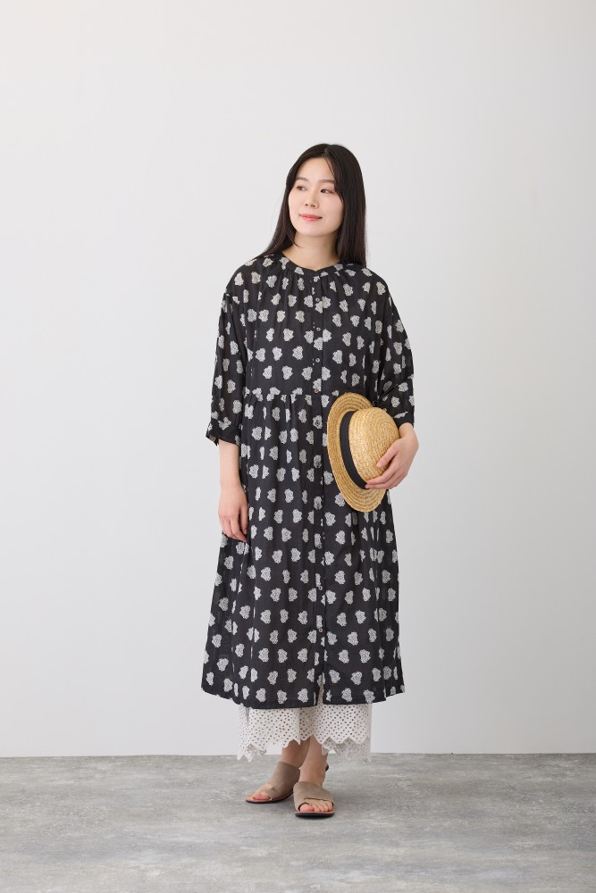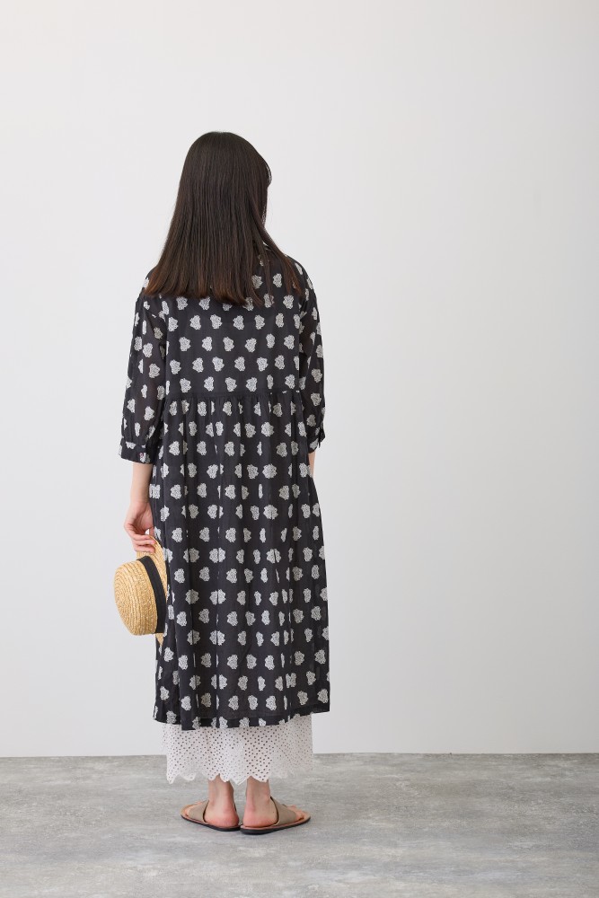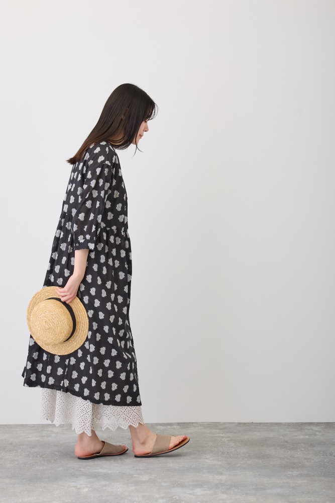 S4711コモンスタンプ前開きワンピース線画の花のまわりを縁取って、スタンプを押したように配置しました。色数を抑えてあるので、コーデに取り入れやすいデザインです。前開きのワンピースは、ボタンを外して羽織としても使える、お役立ちアイテム。