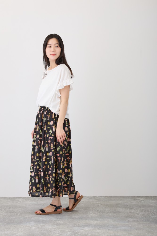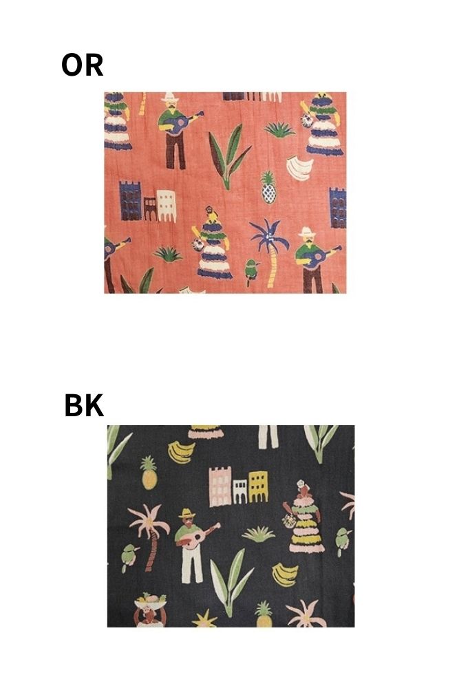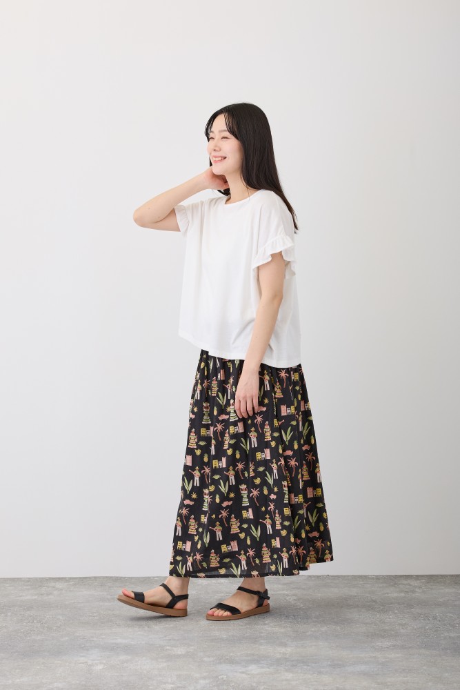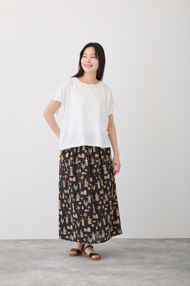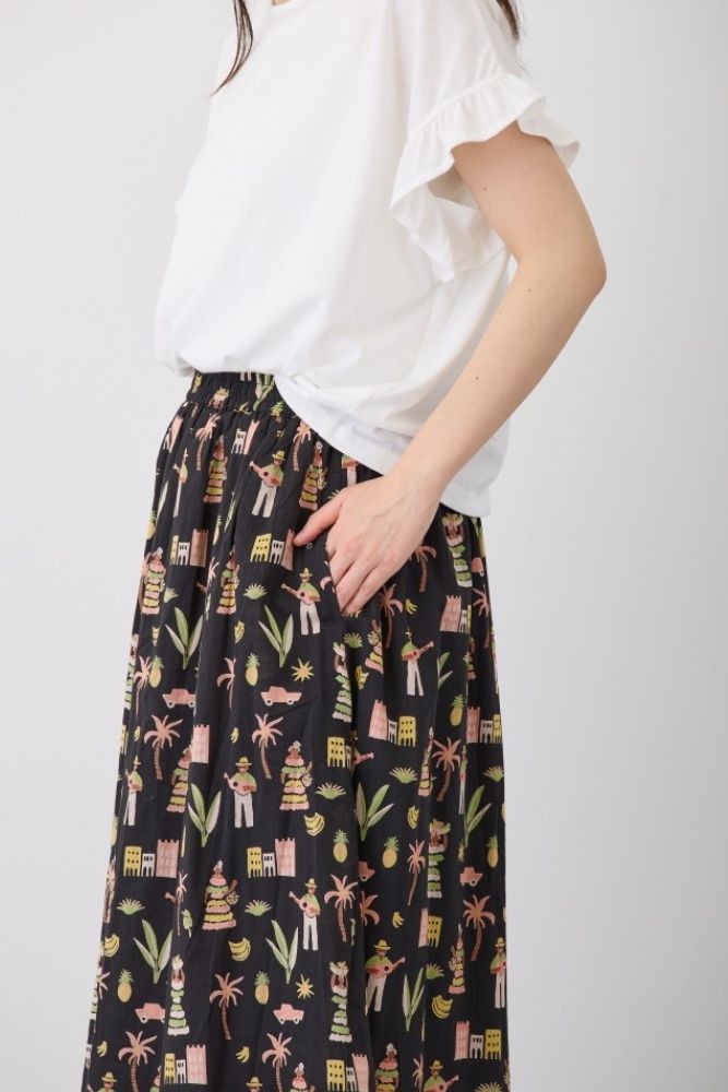 S4719キューバライフスカートキューバのカラフルでレトロな街並みや食べ物などを、ゆるっとしたイラストで描いた面白い柄です。デニムと好相性です。T シャツなど、シンプルなトップスに