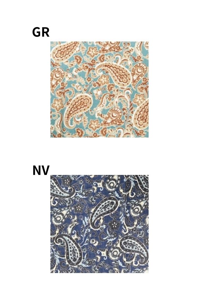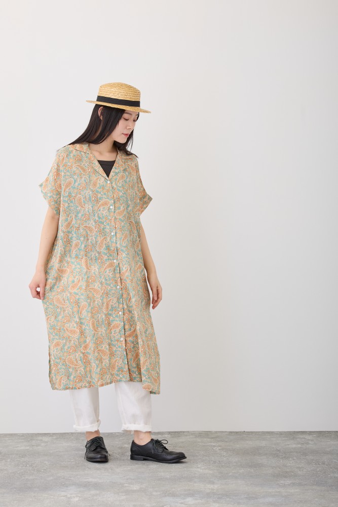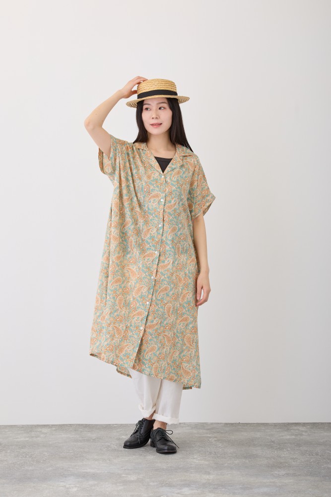 S4713ペイズリー半袖前開きワンピースお花など可愛いモチーフを入れたペイズリー柄。着やすいように、色はナチュラルなカラーに。大人っぽく着ていただけます。ゆったりシルエットの開襟のシャツ