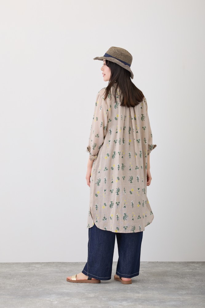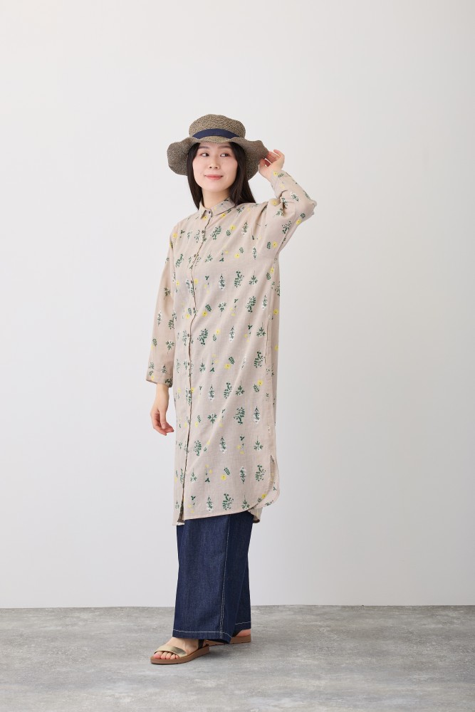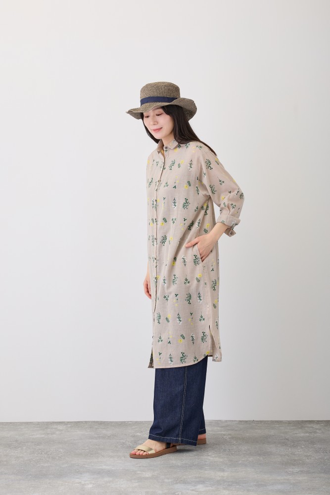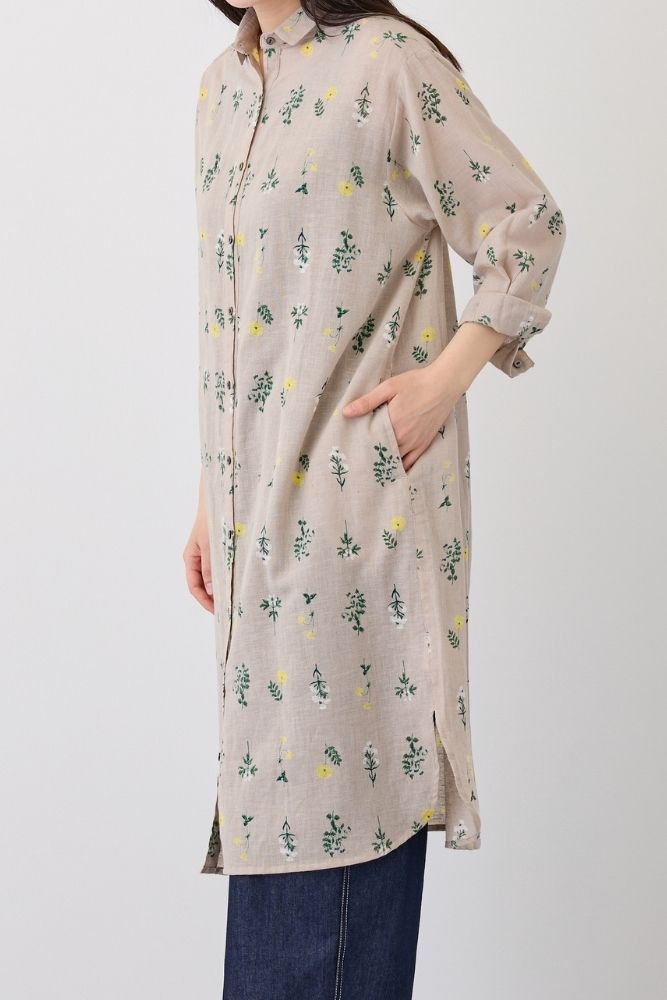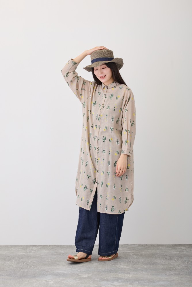 【新作】S4712フラワーレーンシャツワンピースリアルに描いた草花を、余白を持たせてふんわり並べた花柄。綿麻の風合いある生地でやさしい空気感をまとえます。小さめの襟のシャツワンピースです。羽織りとしても使えるので、コーディネートしやすいアイテムです。