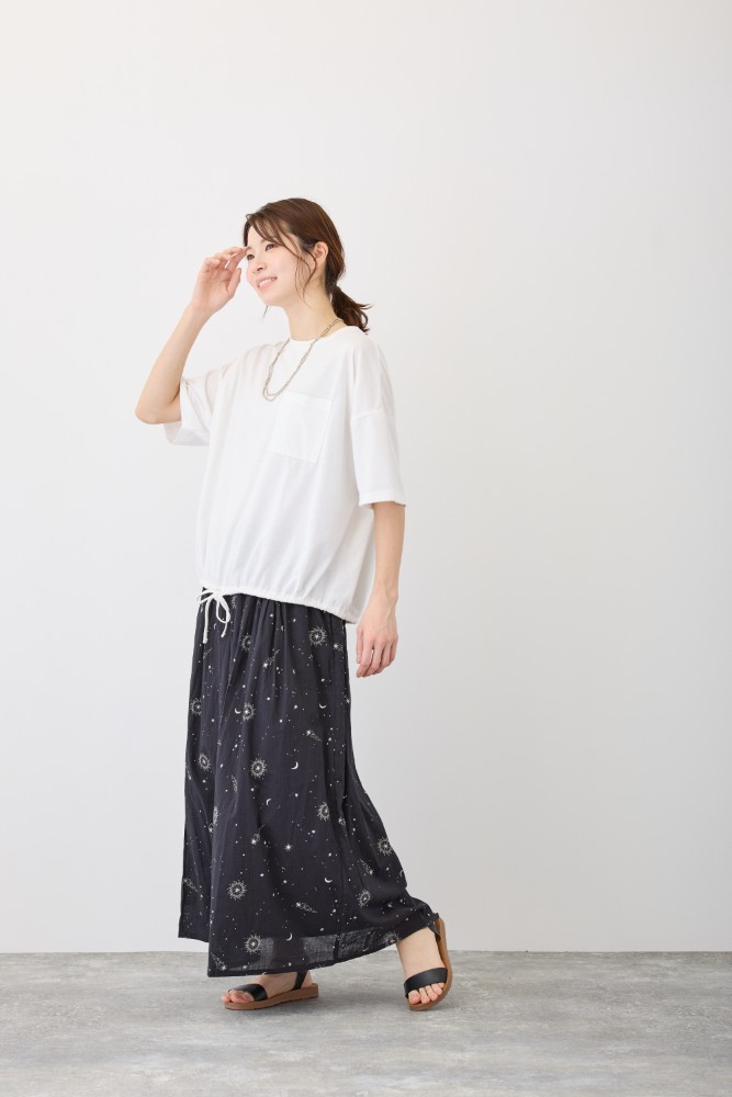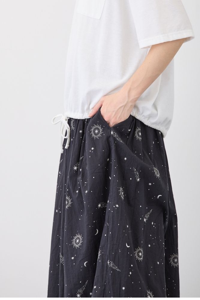 ウエストゴム仕様で、内側紐で調整可能。