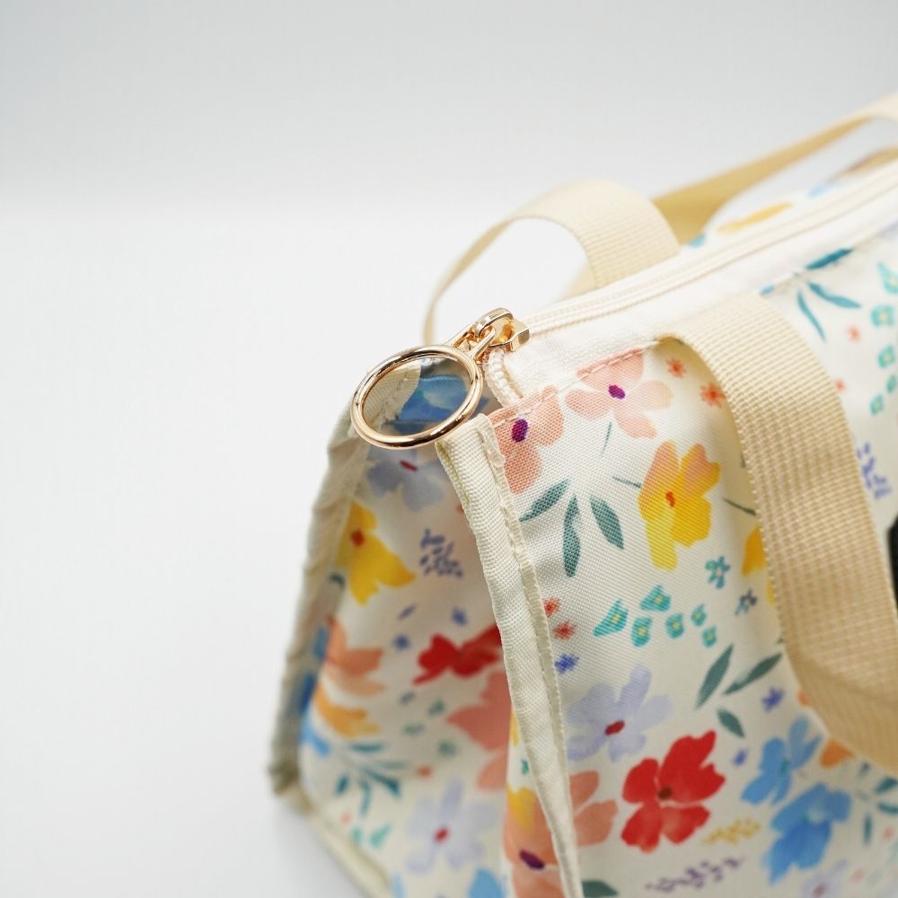 華やかで心が弾む花柄が特徴のスクエアランチバッグです。